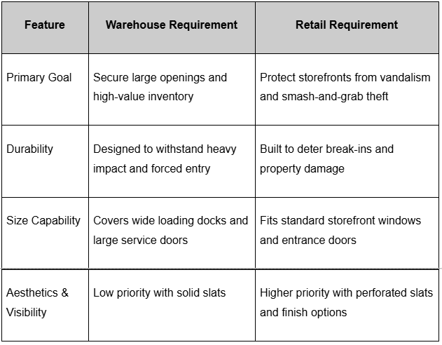 The differing needs of retail and warehouse environments highlight why distinct shutter solutions are used for each.